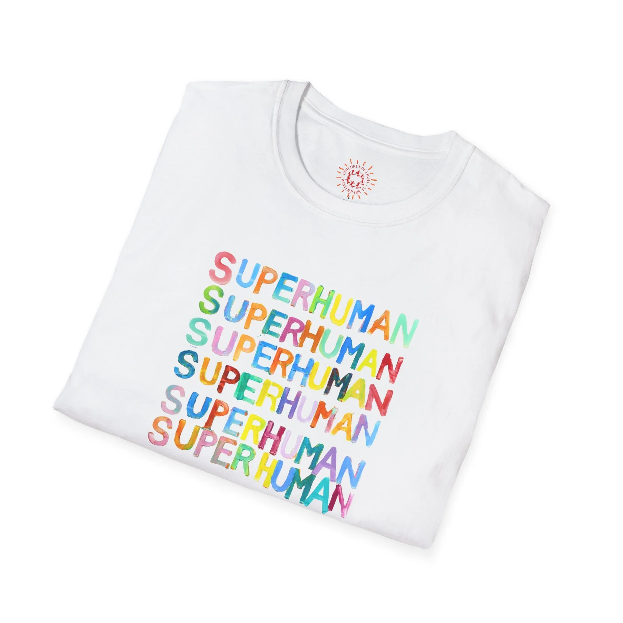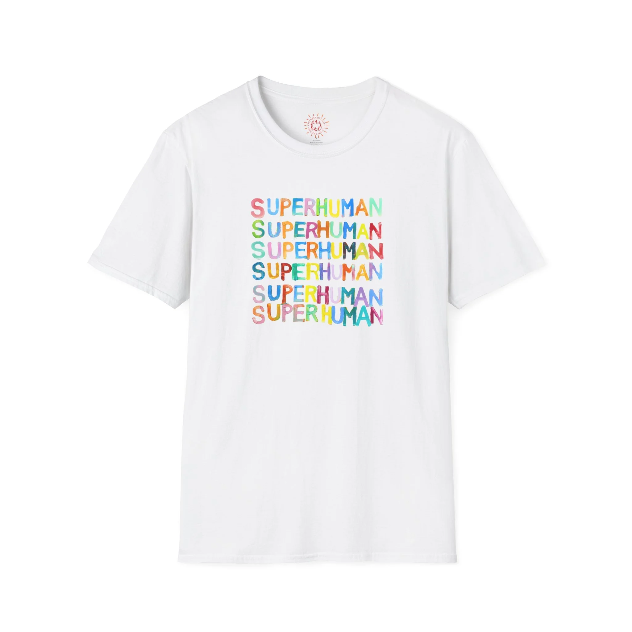Superhuman Rainbow Tee — Repeated 'SUPERHUMAN' Graphic T-Shirt
